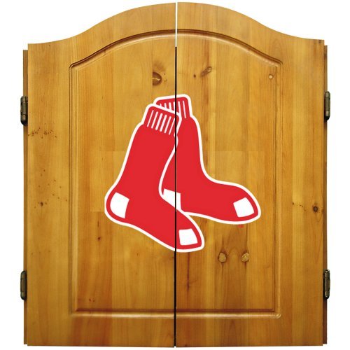 by Imperial Team logo dart board set includes: two-door solid pine cabinet with team logo silk screened on front chalk board chalk and eraser dart trays bristle dart board two scoreboards with team logo set of team logo darts, 3 black, 3 silver with team name on barrel and MLB logo on flight