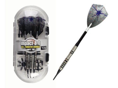 Halex Impact 8.0 Soft Tip Dart Set # 66765 comes stored in a clear, compact dart case which contains fully assembled darts (weights vary). Set includes: 2 sets of flights, 2 sets of shafts, 8 flight protectors, mini dart tool, and 3 spare soft tips.