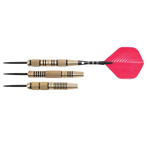 NODOR Striped Brass Steel-tip Dart Set features: Knurled barrels with black stripes, Aluminum shafts, 2-D flights, 20, 22, and 24 gram (gram weights will vary), Set Includes: 3 darts with spare flights and plastic shafts, and Slim carry case. One year warranty against defects.
