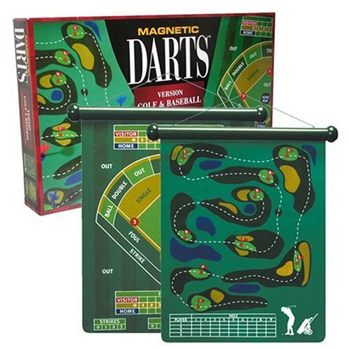 Rained out? You can still hit the greens and run the bases indoors using magnetic darts! With two colorful playing surfaces to choose from, sports fans score points using professionally weighted magnetic darts. Aim for fun and safe indoor activities with this winning team of magnetic baseball and golf. Includes 6 strong magnetic darts, 1 hangable, double-sided, high quality fabric dart board, nylon travel bag, and instructions. For 2 or more players ages 8 and up.