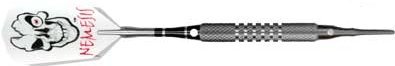 All of the Nemesis 90% tungsten dart line features our Black Steal coating. The Black Steal Tungsten Oxide finish gives this dart an exceptional look and feel. The Nemesis is available in 16 and 18 gram weights. Each set includes 3 darts. Barrel: & 90% Tungsten 9/32-inch Diameter Points: Durable Dart Master Soft Tip Points Shafts: Anodized Aluminum Extras: Flights Dart Master Soft 2BA Tip Points Wrench