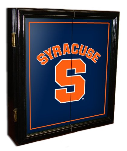 7515-SYR Features: -Comes with 2 scoreboards and mounting bracket for bristle board hanging.-Darts / chalk / wall-mounting hardware not included.-Keeping your cabinet looking new each and every season.-Fits most standard bristle and electronic dartboards. Includes: -Bristle board and board mounting hardware included. Construction: -Solid wood construction. Color/Finish: -Official Syracuse team color and logo.-Sleek, black finish with Brass hinges.-Full-color, digitally-printed graphics. Specifications: -Cabinet (13lbs, 18lbs with bristle board). Dimensions: -Overall dimensions: 26'' H x 23'' W x 4'' D.